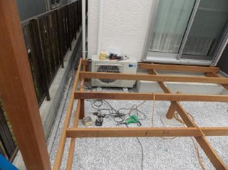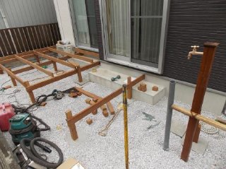 ![]() 続いてはデッキ上に立水栓を付けますので、あらかじめ給排水の設置をし、メインとなるデッキの作成が始まりました。 |