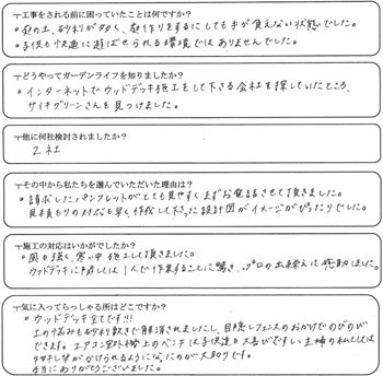 ![]() ホームページからいらしたT様。お庭作りに手が負えない状態で、お子様も快適に遊べないことから、ウッドデッキを作りたいとご相談頂きました。ご要望を取り入れた内容で工事がスタートしました。 |