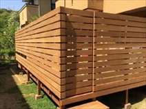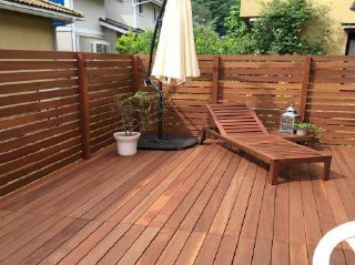 広さ約18帖の広々アイアンウッドデッキ埼玉県所沢市O様邸 費用:149万円 工期:約1週間 約28平方メートル(約18帖)の広さがある、とても広々したアイアンウッドデッキです。フェンスの目地は20mmにして程よい目隠しに。一角に扉を付けてお庭に出入りできるようにしました。 |