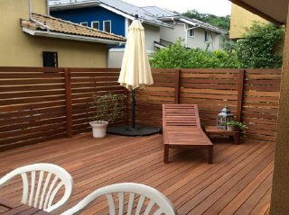 ![]() もともと設置してあったデッキが10年で朽ちてしまい、今回耐久性の強いウリン材(アイアンウッド)を使って造り直すことになりました。 |
