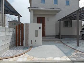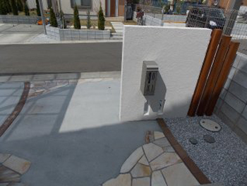 - 川越市 M様邸 白い門袖ナチュラルカラーのアプローチと、花壇のような化粧ブロック塀