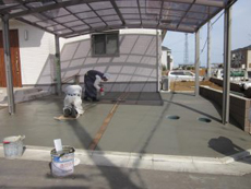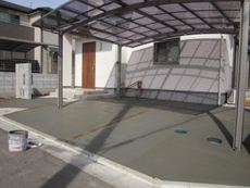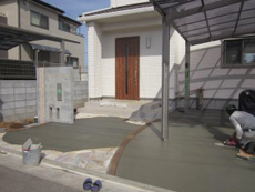 | この日は朝から晴天に恵まれたので、駐車場・アプローチのコンクリートを打設しました。 | 勾配が通常より急なため、刷毛引き仕上げにしました。表面が平らな金ゴテ仕上げと違って、刷毛で表面をならすためざらざらした仕上がりになり、滑り止めの効果があります。 | コンクリートが打ち終わりました。何日か養生期間をとり、完成です。 |