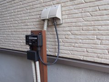 門袖にLIXILのプラスGファンクション機能付き(表札、ポスト、インターホンがセットになっている)のスクリーン(横フェンス)を合わせた仕様でセットいたしました。表札もLED照明にしてあります。 ダウンライト、表札等の照明は12Vを採用。100Vから12Vに変換し、消費電力を10分の1にして抑えています。変換器は建物に設置しないよう(壁に穴を開ける必要があるので)に配慮しています。支えている木材はアイアンウッドです。屋外でも数十年腐りません。