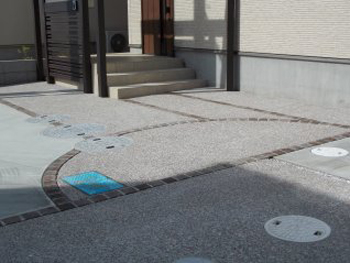 駐車場とアプローチを兼用した床面です。玉砂利洗い出し舗装とコンクリート舗装をバランス良くデザインいたしました。 目地材はエスビックのショコラコロンのモカ色を施設しました。 玉砂利(自然石)洗い出し舗装の拡大画像です。多彩な色の玉砂利があるのですが、今回はお家とのバランスを考えて、日本玉石φ9mmの「南部」という砂利を使用しました。
