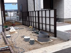 施工中の様子です。駐車場の既存土を重機での掘削から始まりました。 深さを調整しながら掘っています。 玄関前に設置したLIXILのプラスGのフレーム商品、O様のお気に入りです。全体的な完成を楽しみにしています。 隣地側のスクリーンもLIXILのプラスG商品です。お家のモダンな雰囲気に合わせました。こちらもお施主様のお気に入りです。これより駐車場の床面の舗装工事に入ります。