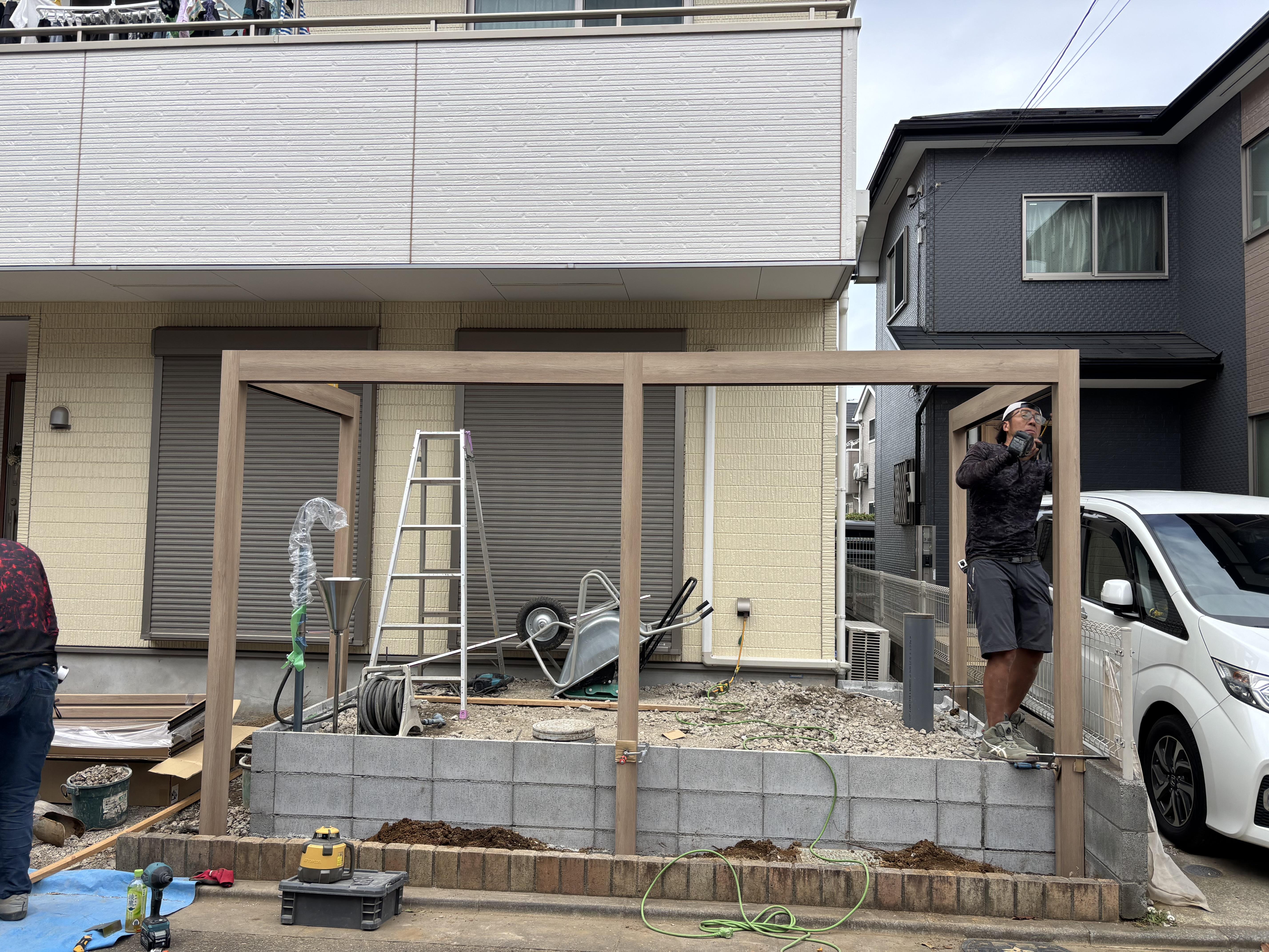 タイルテラスの周りの ブロック積みが完了して、 次はGスクリーンの柱と 枠組みが出来上がりました。 完成間近です(^^) |