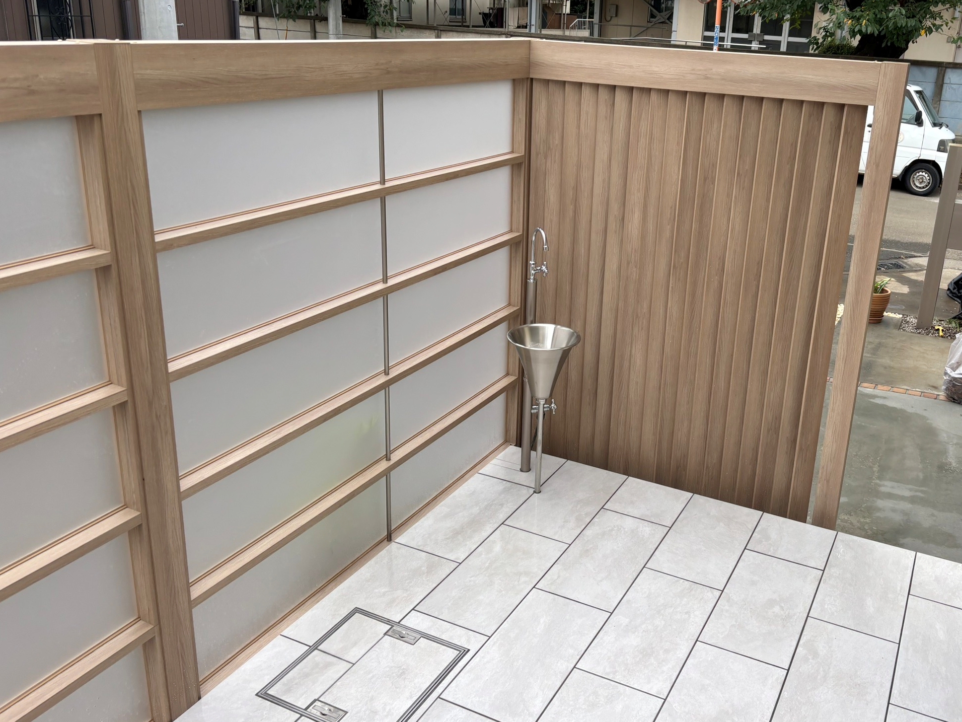 今回は、**LIXILのGスクリーン(オーク色)**を使って目隠しとデザイン性を両立。 ナチュラルな木調とすりガラス調の組み合わせで、 圧迫感を抑えつつ、プライベート空間をやわらかく仕切りました! |