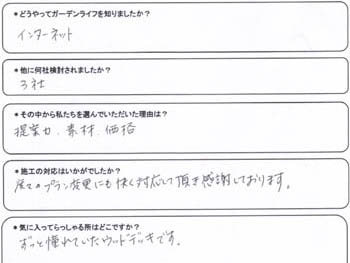 1つ1つがとても丁寧でした。庭全体の雰囲気が気に入っています。