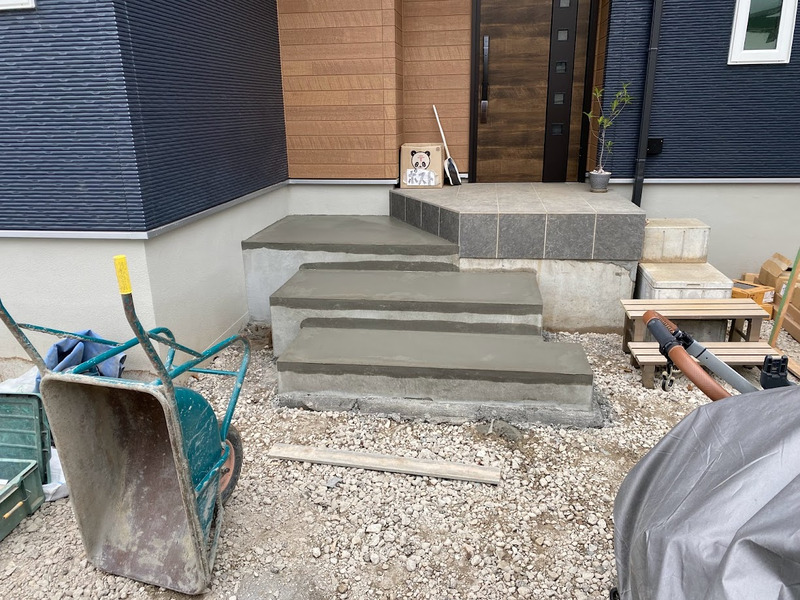 奥から斜め右前方に向かい、石張りの階段を設置するために