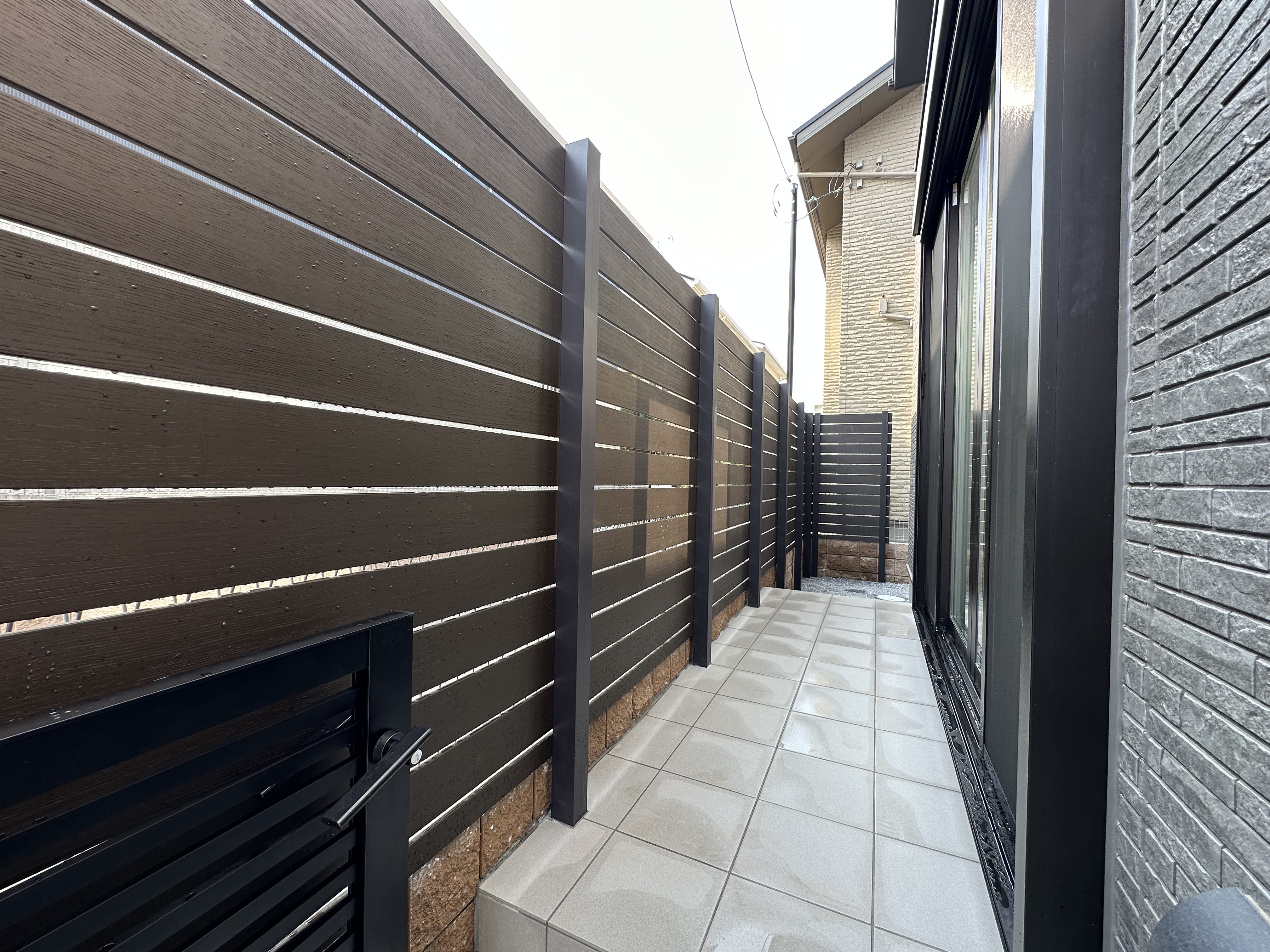 お庭部分には300角のタイルテラスとディーズガーデンのアルファウッドを採用し、