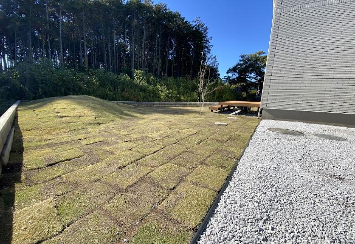 裏の森を借景として起伏をつけた芝張り