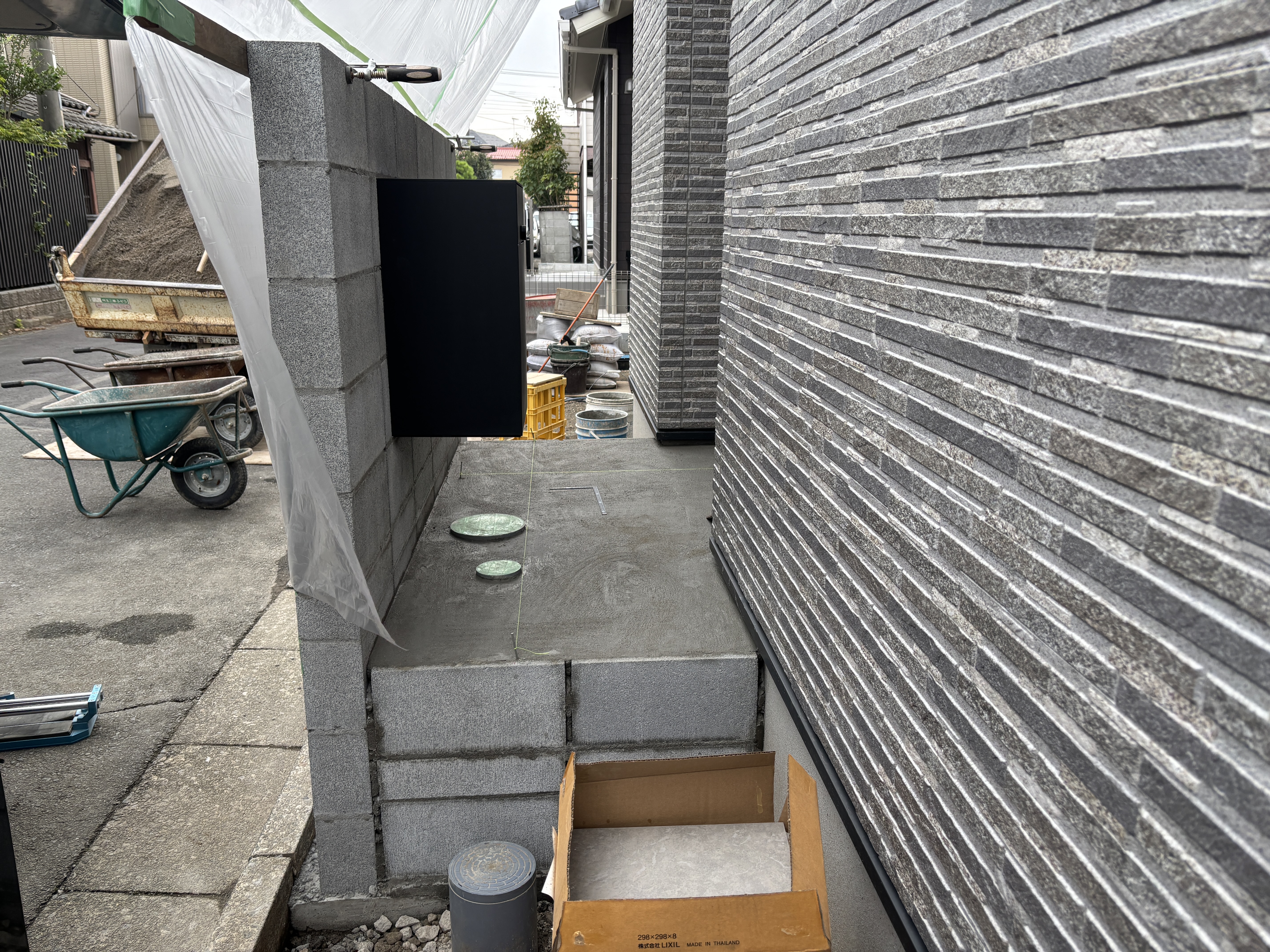 駐車場部分の残土処分を行い、玄関ポーチ・門柱を造っていきます。