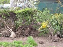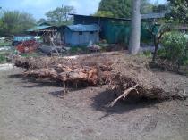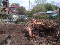 ![]() 先ずはブロック境界線上の抜根工事スタートです。この根がとてつもなく大きい切り株です。悪戦苦闘の末、ハイ抜けました!なんて簡単ではありませんが、掘り出してみると本当に大物です。 |