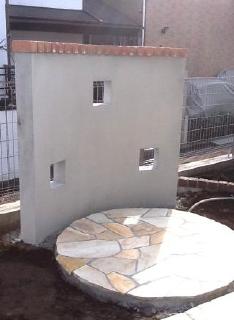 ![]() お庭工事のなかにオシャレな塗り壁をご提案。レンガの笠木を縁取り、くり抜きの穴を付けました。床には乱形石貼りのセンターサークルを敷設して華やかさを出しました。 |