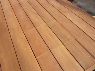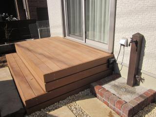 ![]() ウッドデッキが完成いたしました。素材は当社おすすめのウリン材(アイアンウッド)です。自然木の風合いに人気があります。お施主様のご希望で今回は周りの幕板をふさぎました。小動物が入らないよう工夫いたしました。ステップはどこからでも降りられるようにひな壇タイプにいたしました。 |